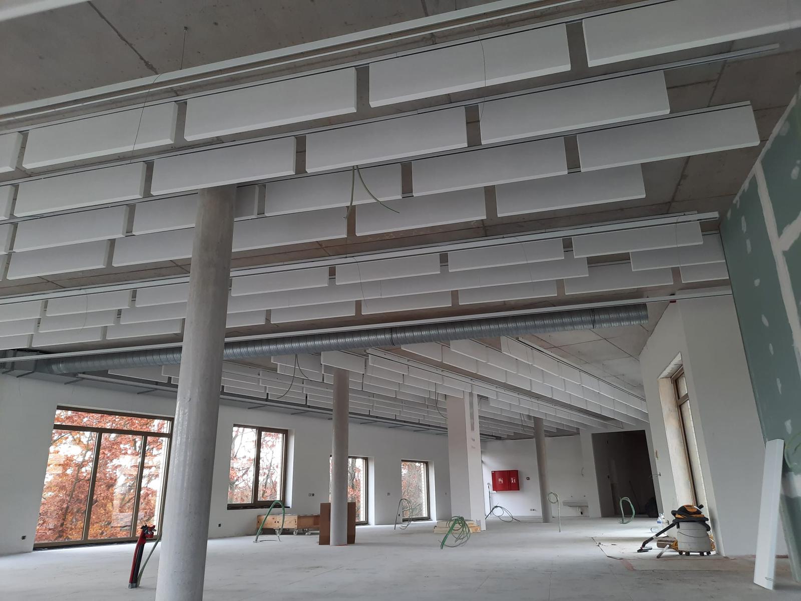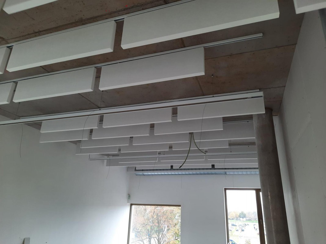 De akoestische oplossing: 1.200 akoestische baffles verdeeld over verschillende verdiepingen en ruimtes. Door deze op een rails te monteren zijn deze strak op lijn geplaatst en geeft het de perfecte combinatie tussen een strak en industrieel design met de juiste akoestiek.